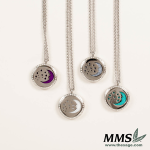 Both the diffuser and chain are made from stainless steel and do not contain nickel. The edge of this diffuser has a crystal pattern. The diameter of this diffuser is 1.19 inches and the total necklace length is 22 inches.